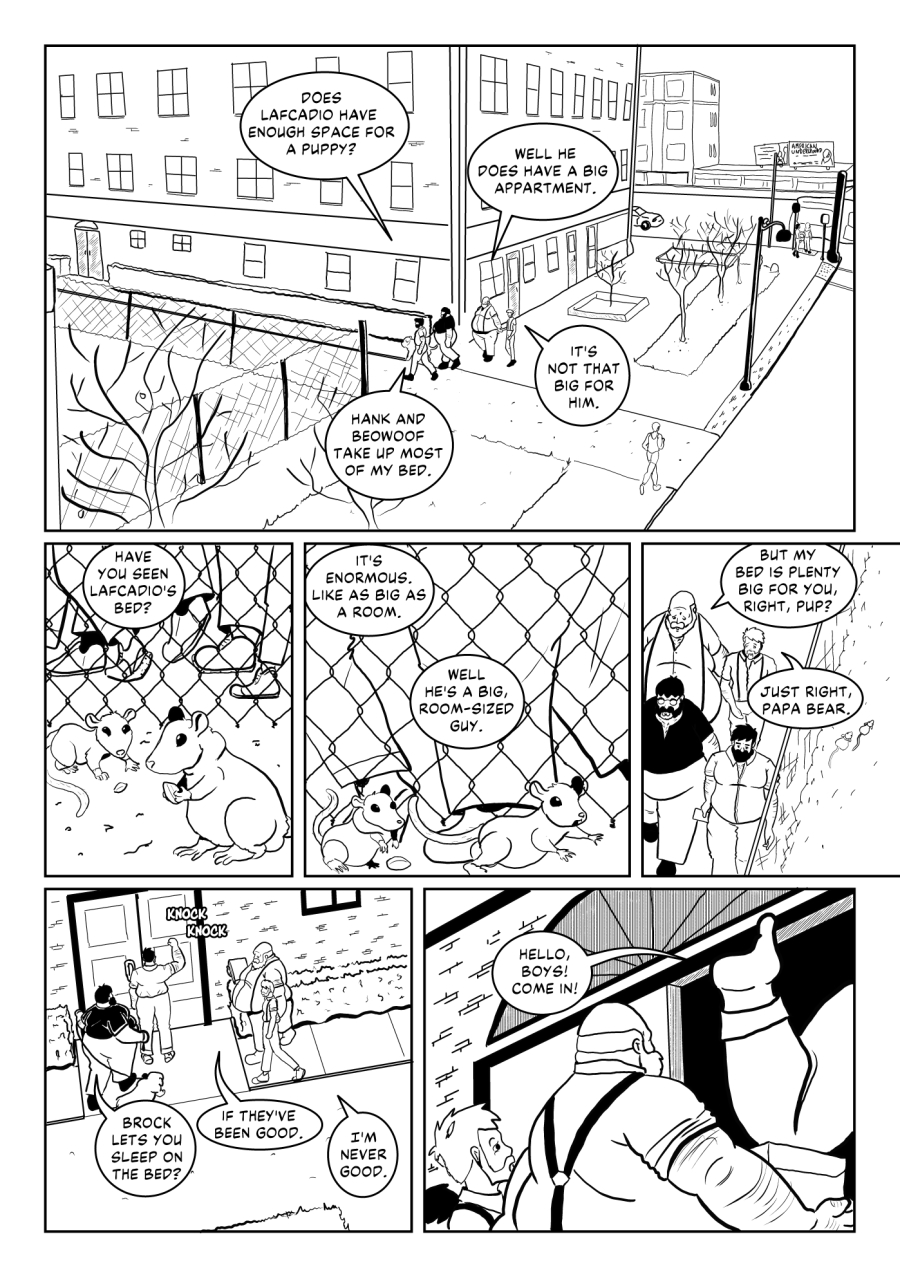 "Brock lets you sleep on the bed?" Hank asks.